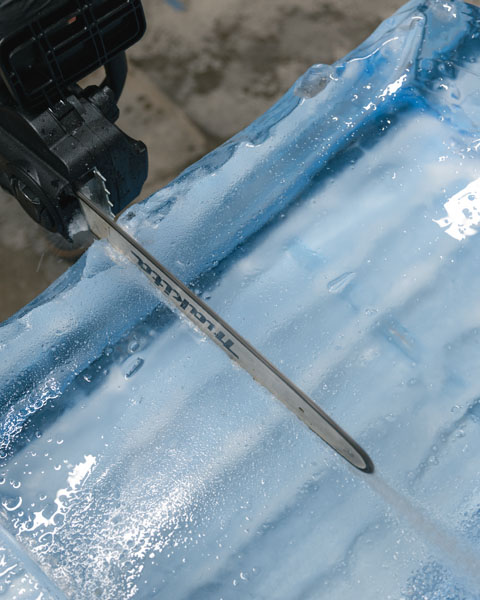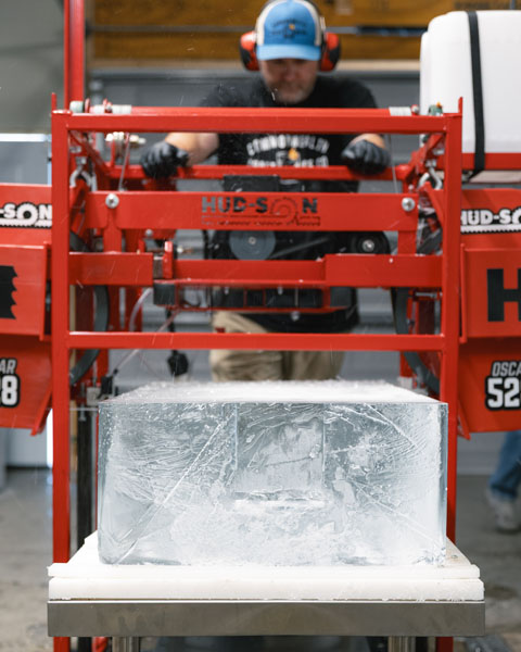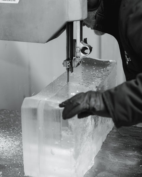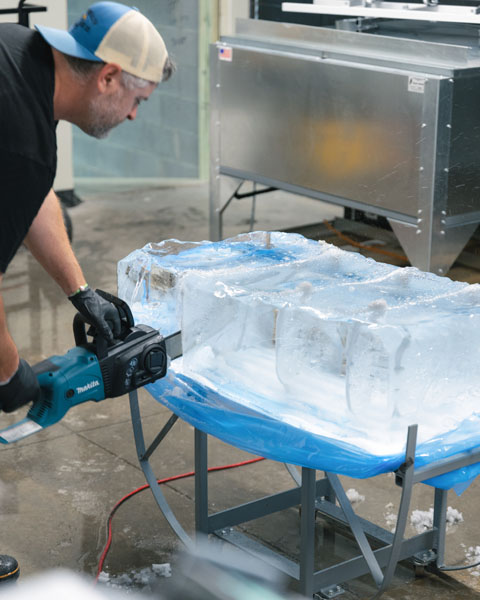 First, we fill our 50-gallon freezer tanks with limestone-filtered water. Then, our three-day freezing process begins, allowing all the sediments to rise to the top of the tank, where they will be discarded to ensure the highest-quality ice possible.